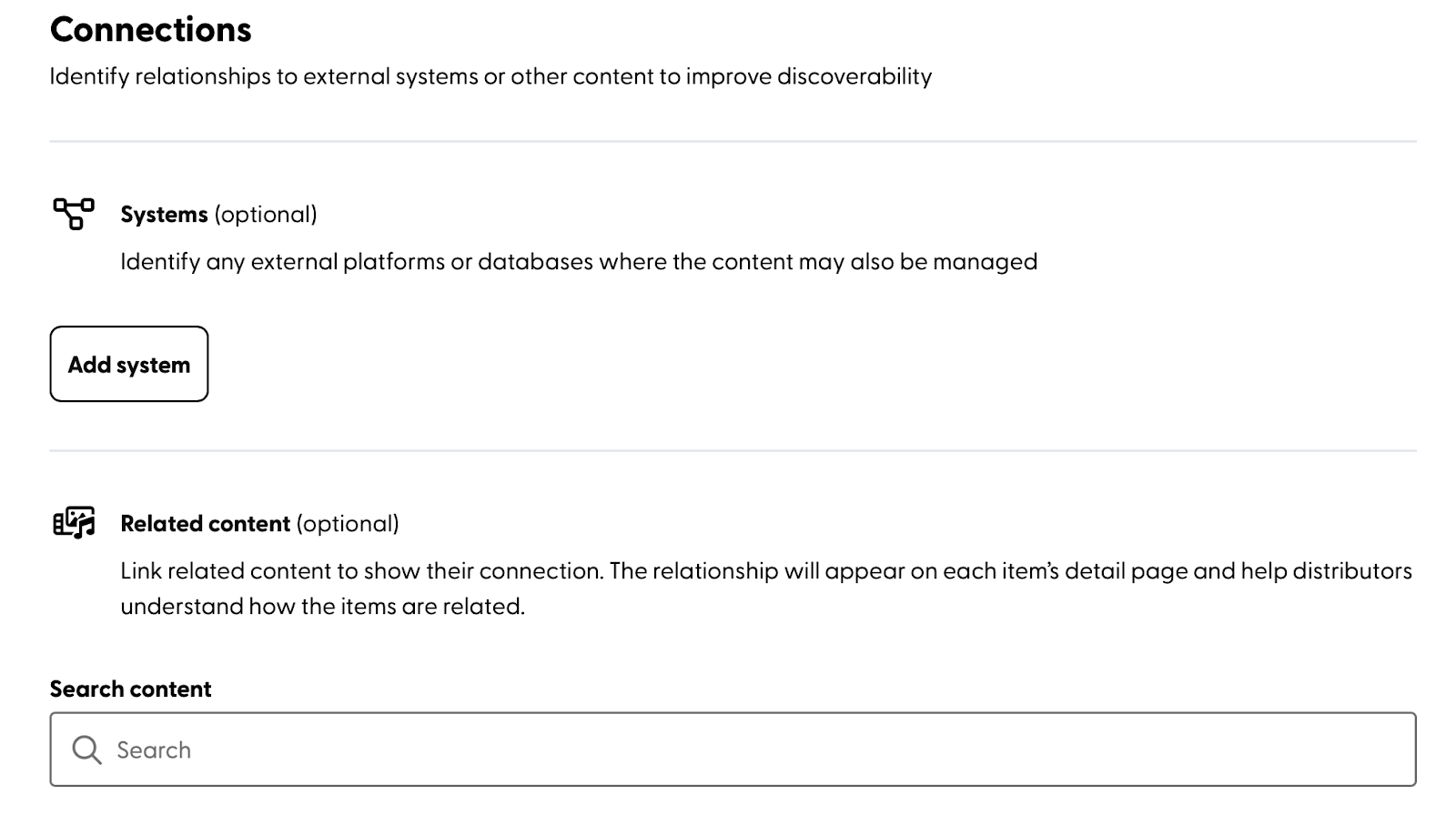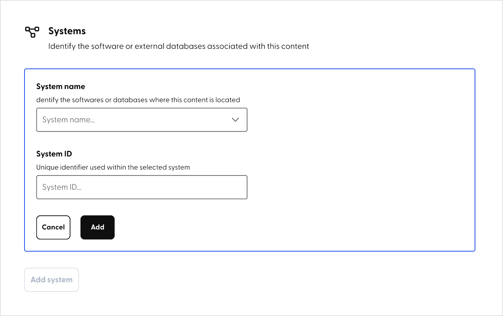 Click on the ‘Add system‘ button, the screen will prompt you to enter information for the external software or database that is associated with this content.