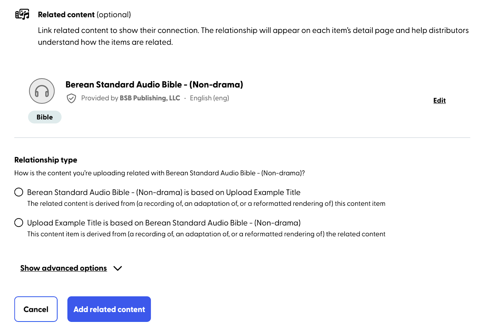 If the selected related content item is audio, you’ll choose the relationship type from one of these options (as shown below):